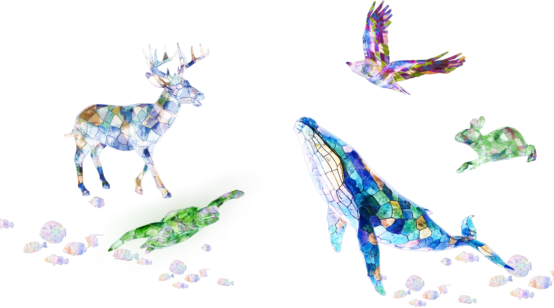大地の温もりを感じながら森の動物たちと戯れる、 ファンタジー映画のような世界。 ※インタラクティブな要素として「葉」を出すことができます。